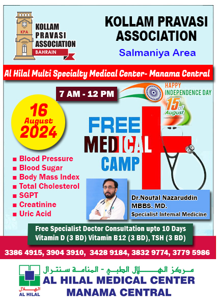 കൊല്ലം പ്രവാസി അസോസിയേഷൻ സൽമാനിയ ഏരിയ കമ്മിറ്റി യുടെ നേതൃത്വത്തിൽ 🇮🇳ഇന്ത്യൻ സ്വാതന്ത്ര്യ ദിനാഘോഷത്തിന്റെ ഭാഗമായി അൽ ഹിലാൽ ഹോസ്പിറ്റലുമായി സഹകരിച്ച് 🗓️ 2024 ഓഗസ്റ്റ് 16 ന് ⏰രാവിലെ 7 മുതൽ ഉച്ചയ്ക്ക് 12 വരെ 📌മനാമ സെൻട്രൽ - അൽ ഹിലാൽ ഹോസ്പിറ്റലിൽ വച്ച് 🚑സൗജന്യ മെഡിക്കൽ ക്യാമ്പ് 🚑സംഘടിപ്പിക്കുന്നു.